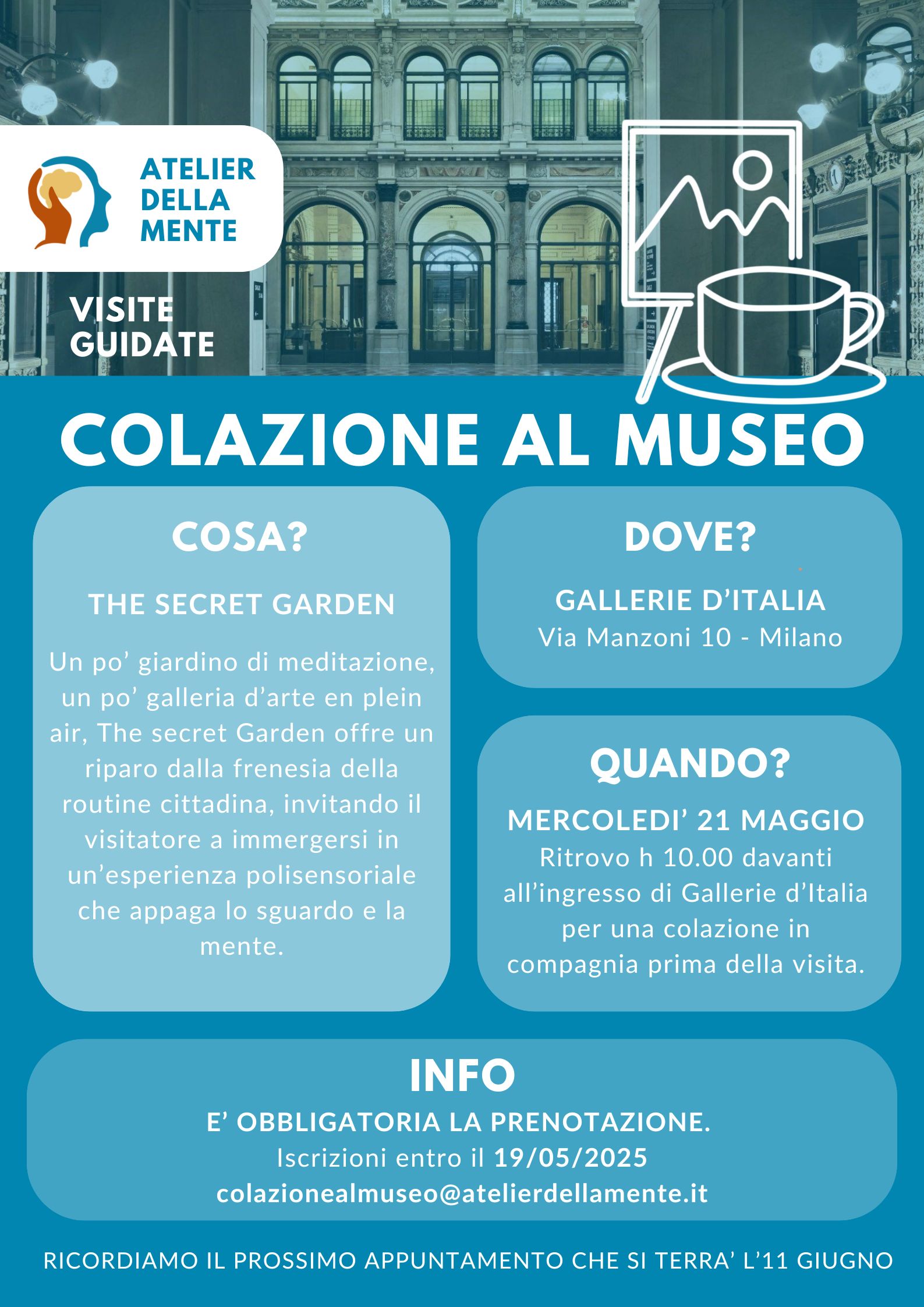 Questa volta visiteremo il giardino: una meravigliosa sorpresa che questo, come tanti palazzi del centro di Milano, ci riserva. Come sempre saremo accompagnati da una guida esperta e formata per coinvolgere anche le persone con problemi di memoria. La visita è gratuita ma è necessaria la prenotazione scrivendo ad Andrea a colazionealmuseo@atelierdellamente.it.